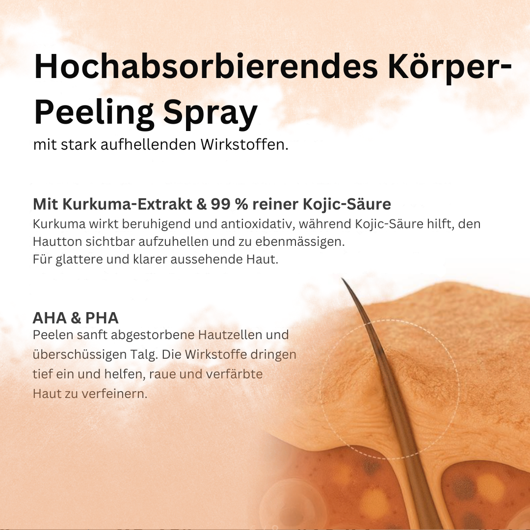 Die kraftvolle Kombination aus Kojic Acid und Kurkuma reduziert Pigmentflecken sichtbar und schenkt deiner Haut ein gleichmässiges, strahlendes Hautbild. Gleichzeitig wirkt das Spray sanft und pflegend, sodass selbst empfindliche Hautpartien wie die Innenschenkel oder Achseln profitieren.